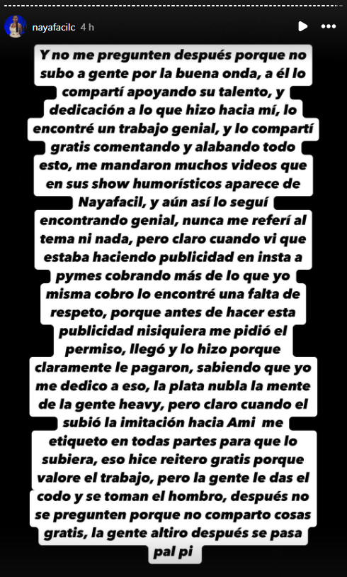 "Cuando vi que estaba haciendo publicidad en Instagram a pymes cobrando más de lo que yo misma cobro lo encontré una falta de respeto, porque antes de hacer esta publicidad ni siquiera me pidió el permiso", declaró en una historia.