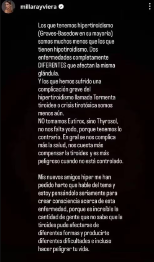 Mediante una historia en Instagram, la otrora conductora de Yo Soy comenzó diciendo que "los que tenemos hipertiroidismo somos muchos menos que los que tienen hipotiroidismo. Dos enfermedades completamente diferentes que afectan la misma glándula".