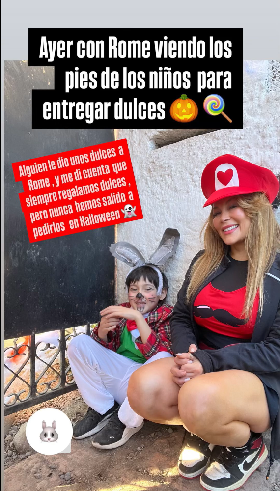 Disfrazada de Mario Bros, la ex edil se lució desde el portón de su casa, esperando que llegaran niños a pedirles dulces, mientras era acompañada de Romeo, quien en esta ocasión se disfrazó de un conejo.