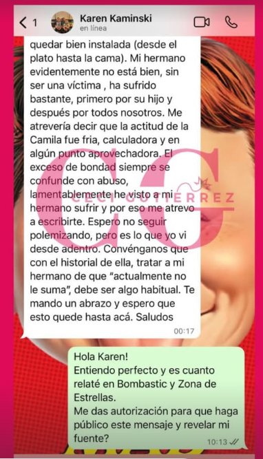 “Lamentablemente he visto a mi hermano sufrir y por eso me atrevo a escribirte. Espero no seguir polemizando, pero es lo que yo vi desde adentro. Convengamos que, con el historial de ella, tratar a mi hermano de que ‘actualmente no le suma’, debe ser algo habitual”, cerró.