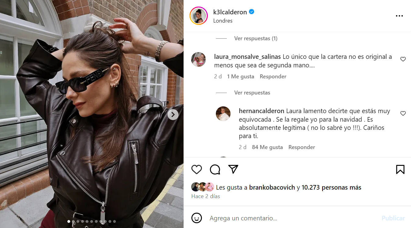 “Lo único, que la cartera no es original, a menos que sea de segunda mano”, fue el comentario de un usuario que cuestionó la veracidad del accesorio que mostró la influencer en una de sus publicaciones de su viaje por Londres, lo que despertó la molestia de Hernán Calderón.
