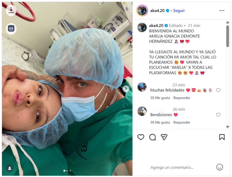 Junto con lo anterior, escribió: "Ya llegaste al mundo y ya salió tu canción, mi amor, tal cual lo planeamos. Vayan a escuchar Amelia por todas las plataformas".