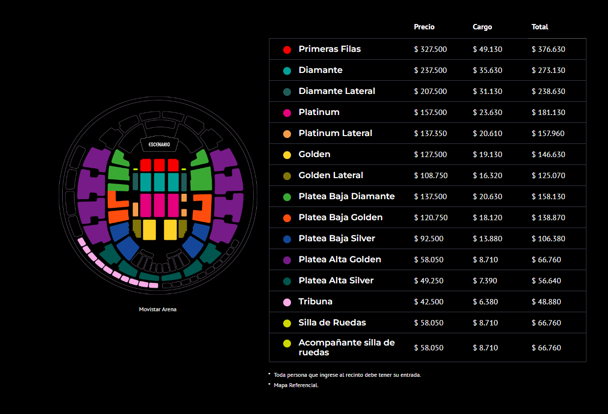 Los precios de las entradas para los conciertos de Luis Miguel en Chile van desde los $48.880 hasta los $376.630, incluyendo el cargo por servicio.