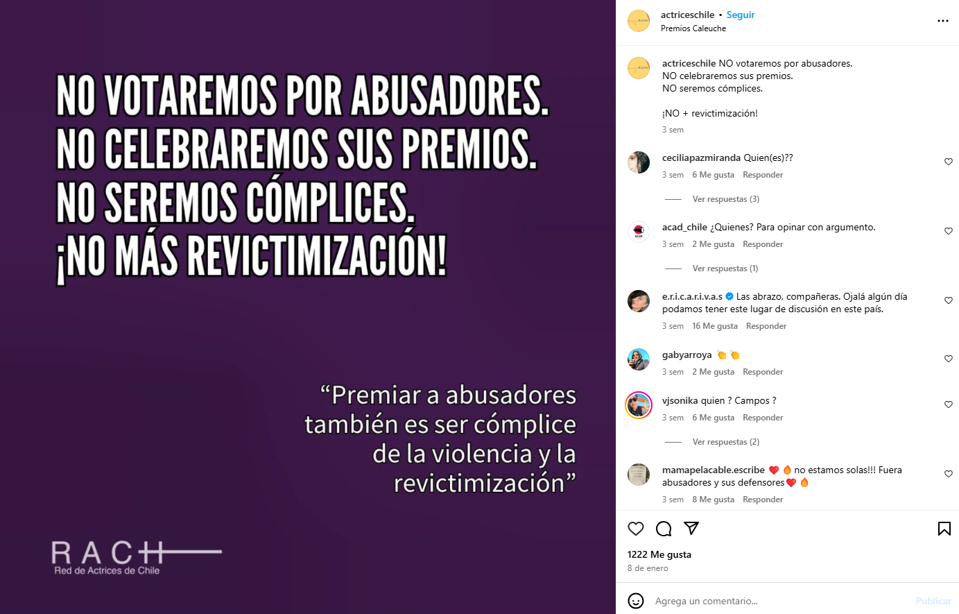 Tres semanas antes de la premiación, el gremio de actrices chilenas publicó un potente mensaje llamando a no votar por "abusadores". "Premiar a abusadores también es ser cómplice", escribieron.