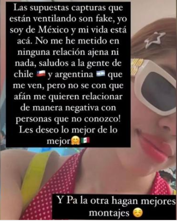 “Las supuestas capturas que están ventilando son fake, yo soy de México y mi vida está acá. No me he metido en ninguna relación ajena, ni nada”, escribió la intérprete de la "Línea del Perreo".