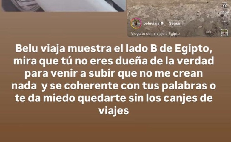 Eso despertó el enojo de la exreina del Festival de Viña del Mar, quien replicó en un duro mensaje: “Belu Viaja muestra el lado B de Egipto. Mira, tú no eres dueña de la verdad para venir a subir que no me crean nada y sé coherente con tus palabras, o te da miedo quedarte sin los canjes de viajes”.