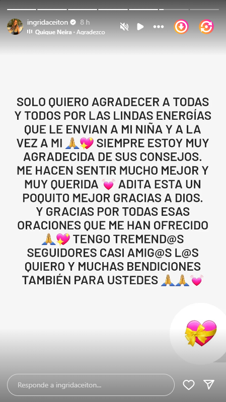 "Solo quiero agradecer a todas y todos por las lindas energías que le envían a mi niña y a la vez a mí. Siempre estoy muy agradecida con sus consejos, me hacen sentir mucho mejor y muy querida. Gracias por todas sus oraciones que me han ofrecido. Tengo tremendos seguidores, casi amigos, los quiero y muchas bendiciones", escribió en una historia de Instagram.