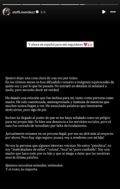 "He dejado una relación que fue dañina para mí, tanto como persona como madre. He sido cuestionada, menospreciada y limitada de maneras que muchos nunca llegan a ver. He escuchado palabras que intentaron destruirme, pero sigo de pie", agregó.