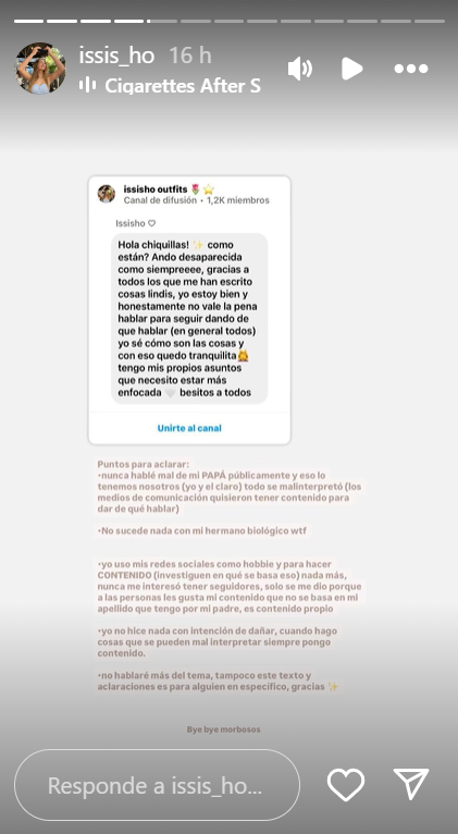 "Nunca hablé mal de mi papá públicamente y eso lo tenemos (claro) nosotros, todo se malinterpretó (los medios de comunicación quisieron tener contenido para dar qué hablar)", escribió.