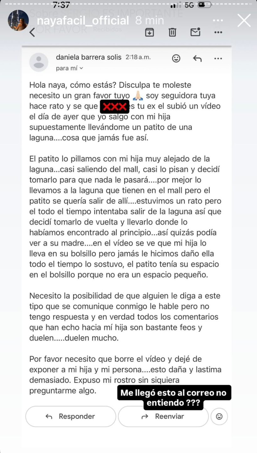 Naya mostró el correo en sus historias de Instagram, donde la mujer señala: "Necesito un gran favor, soy seguidora tuya hace rato y sé que Sergio es tu ex. Él subió un vídeo el día de ayer en el que yo salgo con mi hija supuestamente llevándome un patito de una laguna, cosa que jamás fue así".