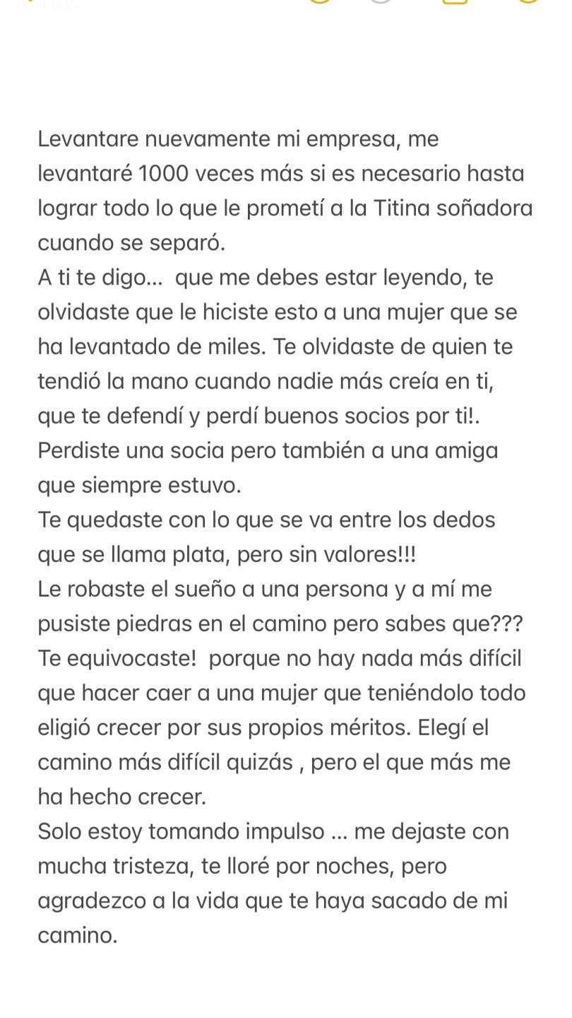 "Tengo la verdad en mis manos, el vale vista fue robado y cobrado por mi ex socio y 'amigo' hace 11 años, teniendo todas mis claves, accesos, etc (...) ¿Tengo responsabilidad yo? Claramente sí, por ser la dueña de la empresa ¿Robé el vale vista yo? ¡No!", señaló Titi.