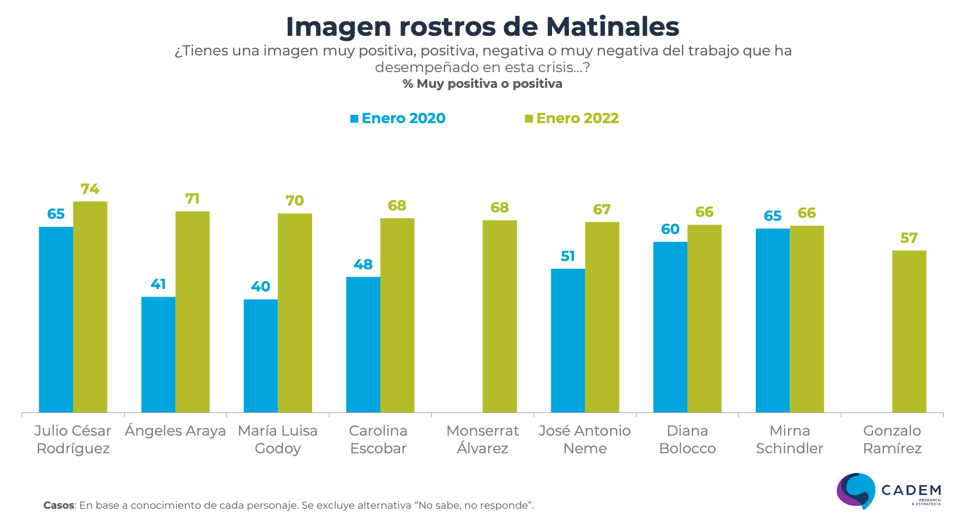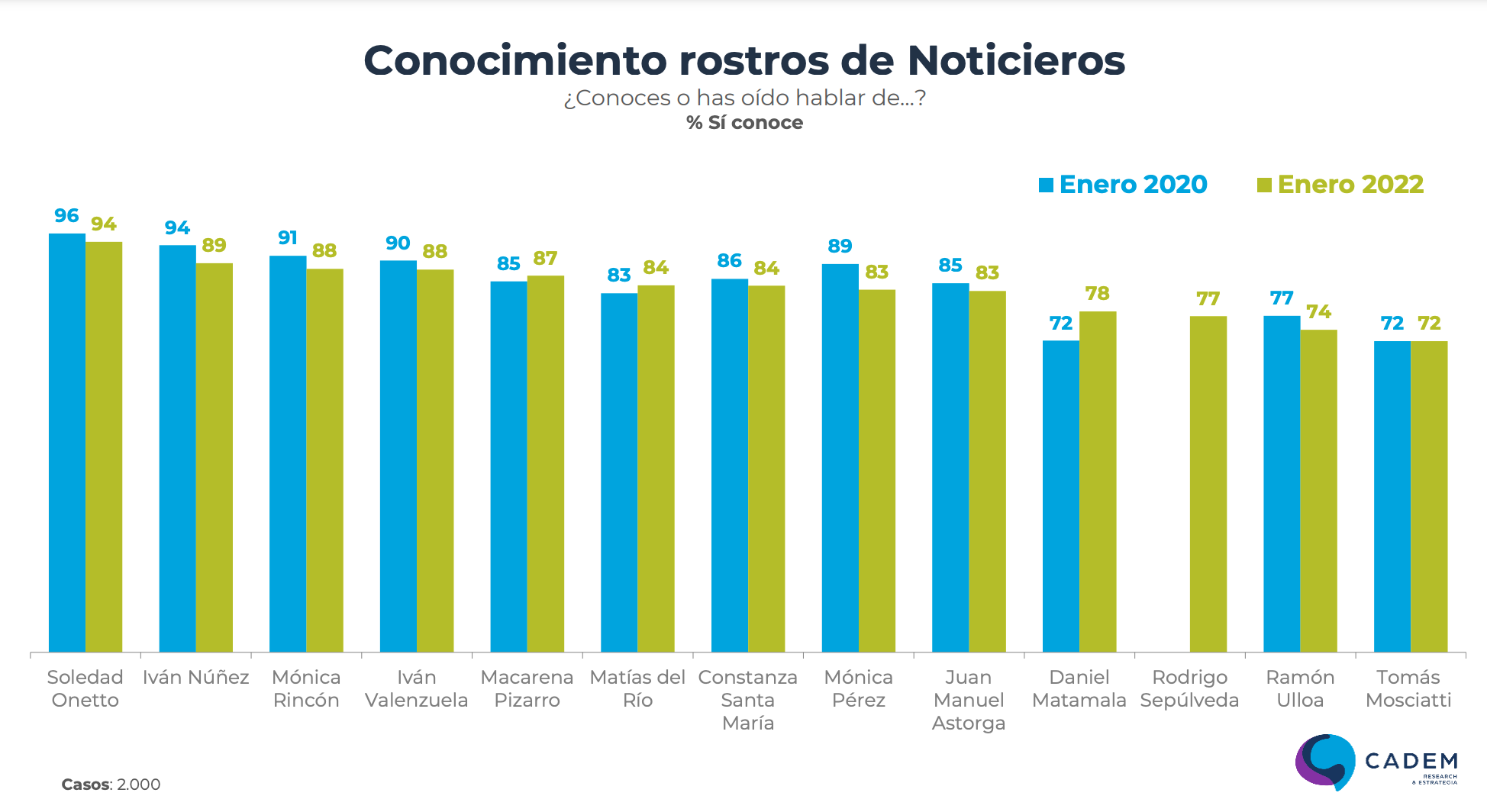 La misma consulta se aplicó para evaluar a los rostros de los noticieros. Respecto del conocimiento de ellos, Mónica Rincón obtuvo el tercer lugar con un 88% en enero de 2022. Luego, en el quinto lugar, se encuentra Macarena Pizarro con el 87% y Daniel Matamala en el décimo con un 78%.