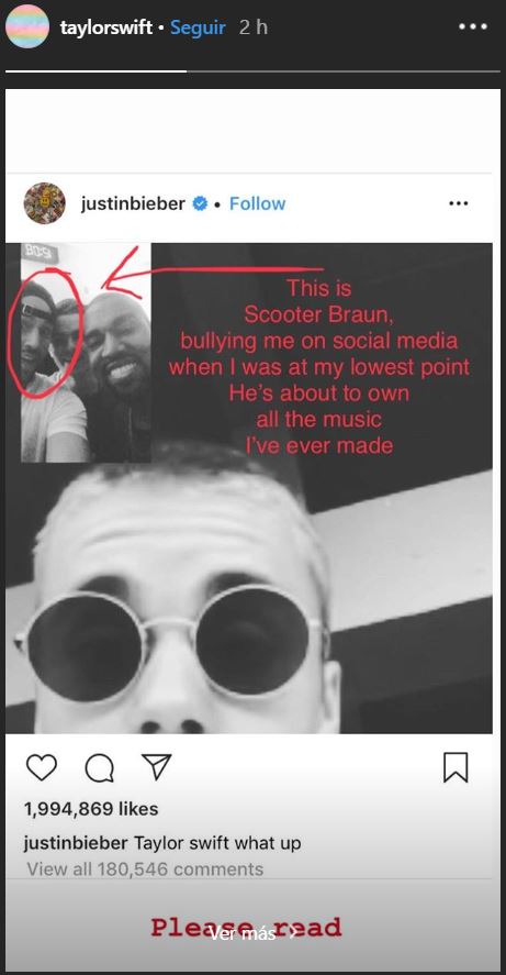Finalmente, Bieber instó al diálogo y llamó a la artista a reunirse con el ahora dueño de Big Machine Record. "Ni scooter ni yo tenemos algo negativo que decir sobre ti, de verdad queremos lo mejor para ti. Por lo general, no refuto cosas como esta, pero al intentar desfigurar a alguien que quiero estás cruzando una línea", concluyó.