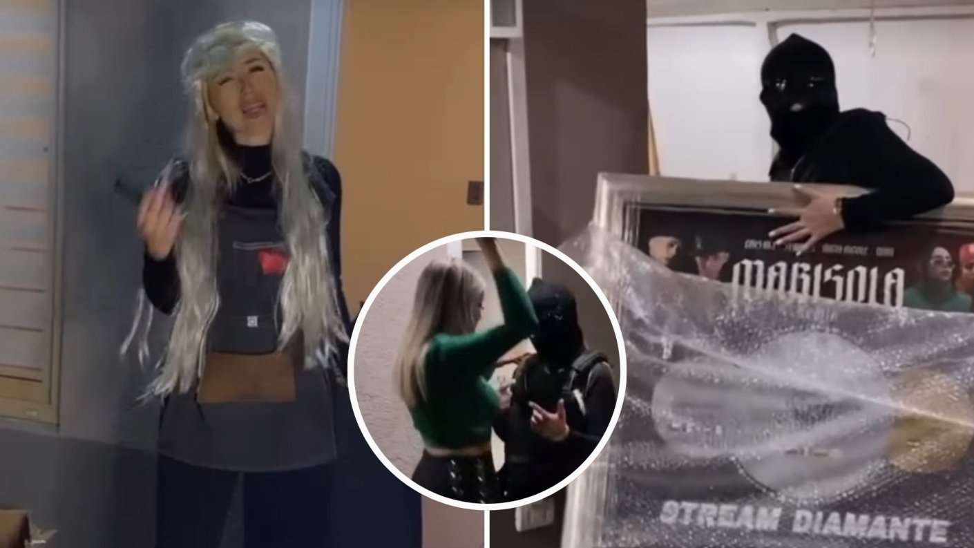Acto seguido, la modelo se encapuchó y envolvió en una bolsa de burbujas el reconocimiento de "Disco de Diamante" para la canción "Marisola" de Cris MJ, haciendo un gesto con sus manos en relación a una pistola, mientras sus amigas ríen.