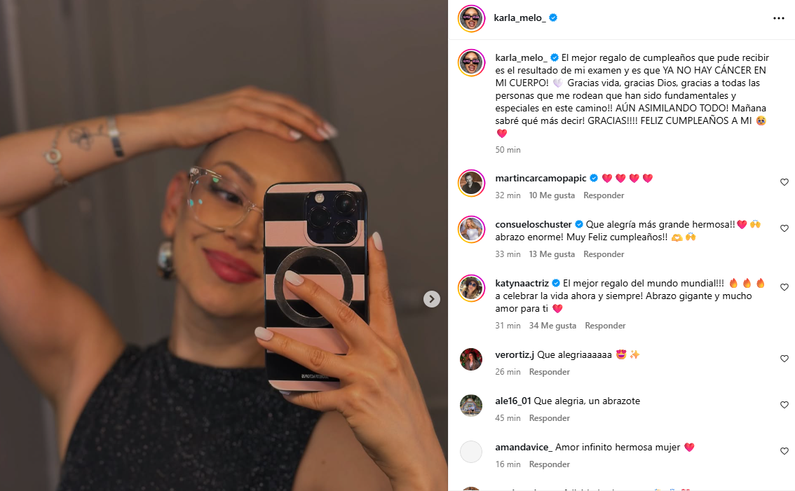 Tras la publicación, Karla Melo generó una ola de comentarios en la mencionada red social. "Qué alegría más grande", "hay que celebrarte", "el mejor regalo del mundo" y "felicidades sobreviviente", fueron parte de las reacciones.