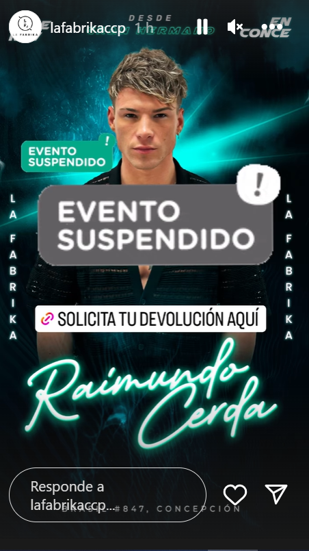 Esta tarde la discoteque La Fabrika, anunció a través de sus redes sociales la suspensión del evento de Raimundo Cerda, el que se iba a realizar en la ciudad de Concepción. El club nocturno dio a conocer la noticia a través de sus historias de Instagram, dejando un enlace para que las personas que habían adquirido las entradas para conocer al ex Gran Hermano pudieran solicitar la devolución de su dinero.