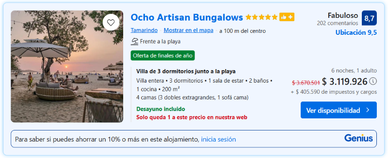 En un ejercicio de simulación realizado en la página Booking, una estadía de siete días, entre el lunes 6 y domingo 12 de octubre, el precio para una persona alcanza $3.119.926 + $405.590 de impuestos y cargo. Es decir, unos $3.525.516. Eso sí, el precio podría variar, ya que el mes en el que se queda (septiembre) y el de la simulación (octubre) son diferentes.