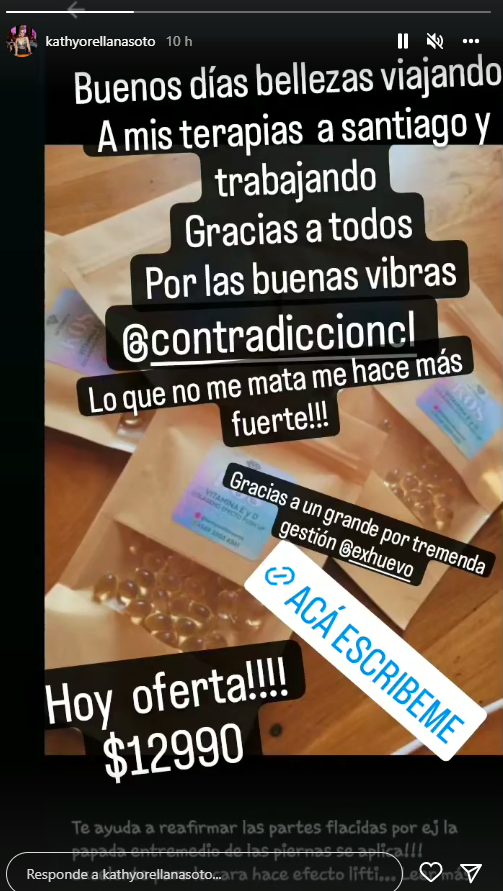 "Viajando a mis terapias a Santiago y trabajando", indicó la oriunda de Rancagua en la publicación. "Gracias a todos por las buenas vibras @contradiccioncl", continuó.