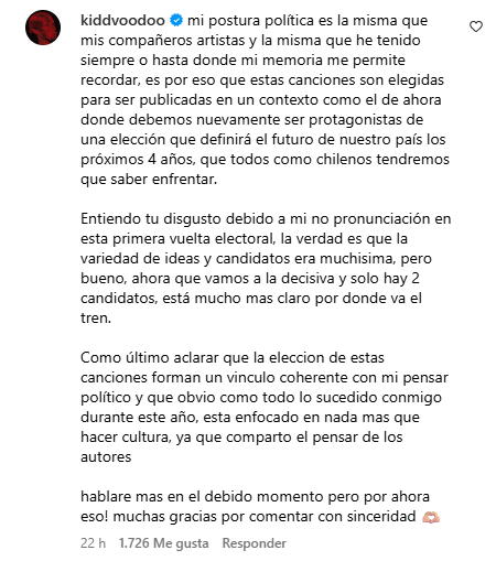 "Es por eso que estas canciones son elegidas para ser publicadas en un contexto como el de ahora donde debemos nuevamente ser protagonistas de una elección que definirá el futuro de nuestro país los próximos 4 años, que todos como chilenos tendremos que saber enfrentar", agregó.