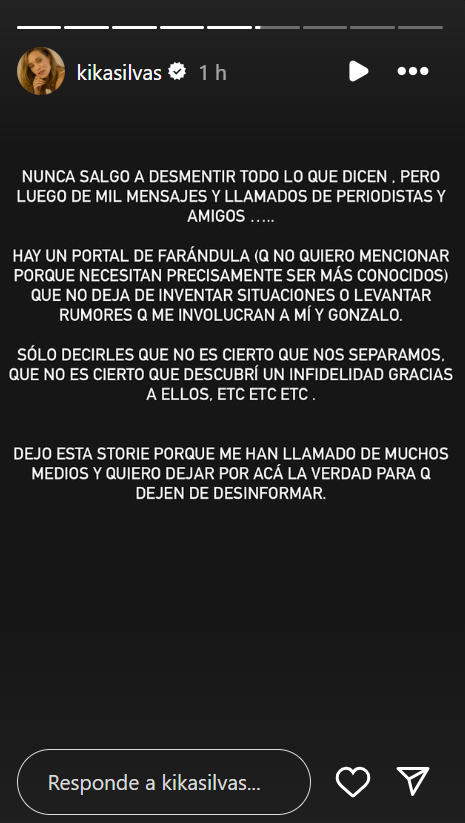 "Sólo decirles que no es cierto que nos separamos, que no es cierto que descubrí una infidelidad gracias a ellos, etc etc etc", declaró en el mensaje.