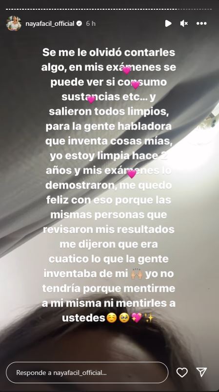 La nueva cirugía estética de Naya Fácil generó una gran polémica a través de redes sociales. Tras la preocupación de sus seguidores, la influencer decidió romper el silencio y referirse al respecto. La joven viajó a Colombia para realizarse una operación que consistía en sacarse grasa abdominal y de brazos para inyectársela en los glúteos. Las imágenes de la intervención y su post operatorio generó cientos de comentarios, por lo que Naya Fácil aclaró las dudas respecto a su condición. "Se me olvidó contarles algo. En mis exámenes se puede ver si consumo sustancias, etc. y salieron todos limpios, para que la gente habladora que inventa cosas mías. Yo estoy limpia hace dos años y mis exámenes lo demostraron", comentó. En las historias de su cuenta de Instagram también señaló que se siente feliz con aquellos resultados. "Las mismas personas que revisaron mis resultados me dijeron que era cuático lo que la gente inventaba de mí. Yo no tendría por qué mentirme a mí misma ni mentirles a ustedes", concluyó. Cabe recordar que esta es la segunda intervención que se realiza. En el año 2021 también viajó al mismo país para una intervención similar, donde se sacó grasa de brazos, espalda, abdomen, piernas, papada y mentón.