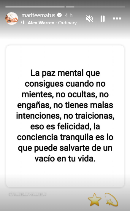 “La paz mental que consigues cuando no mientes, no ocultas, no engañas, no tienes malas intenciones, no traicionas. Eso es felicidad”, dice el mensaje.