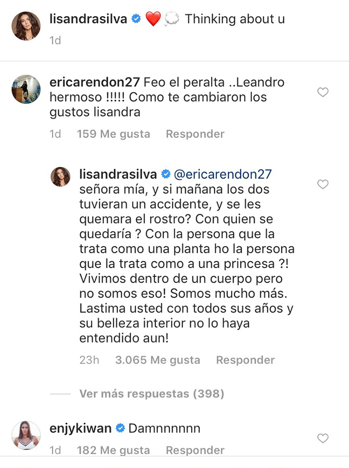 “Tienes toda la razón pero lo q no sabía es q Leandro te tratara como una planta, se os veía tan bien... espero sean felices cada uno por su lado 😍” y “qué raro q con lea te hayas sentido como planta puesto q tus publicaciones eran de puro amorrrrr”, fueron algunos de los comentarios que recibió.