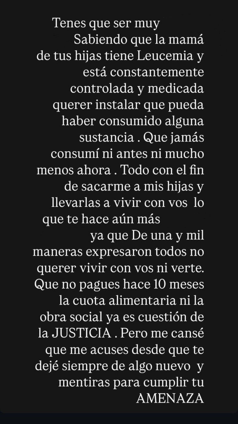 En esa misma línea, agregó: "Que jamás consumí, ni antes, ni mucho menos ahora. Todo con el fin de sacarme a mis hijas y llevarlas a vivir contigo, lo que te hace aún más hij...".
