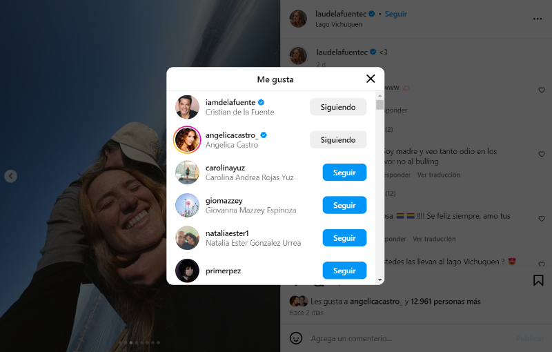Se trata de sus dos padres, Cristián de la Fuente y Angélica Castro, quienes se hicieron presentes en la red social dando "me gusta" a la comentada publicación, convirtiéndose en dos de los casi 13 mil "likes" al post.