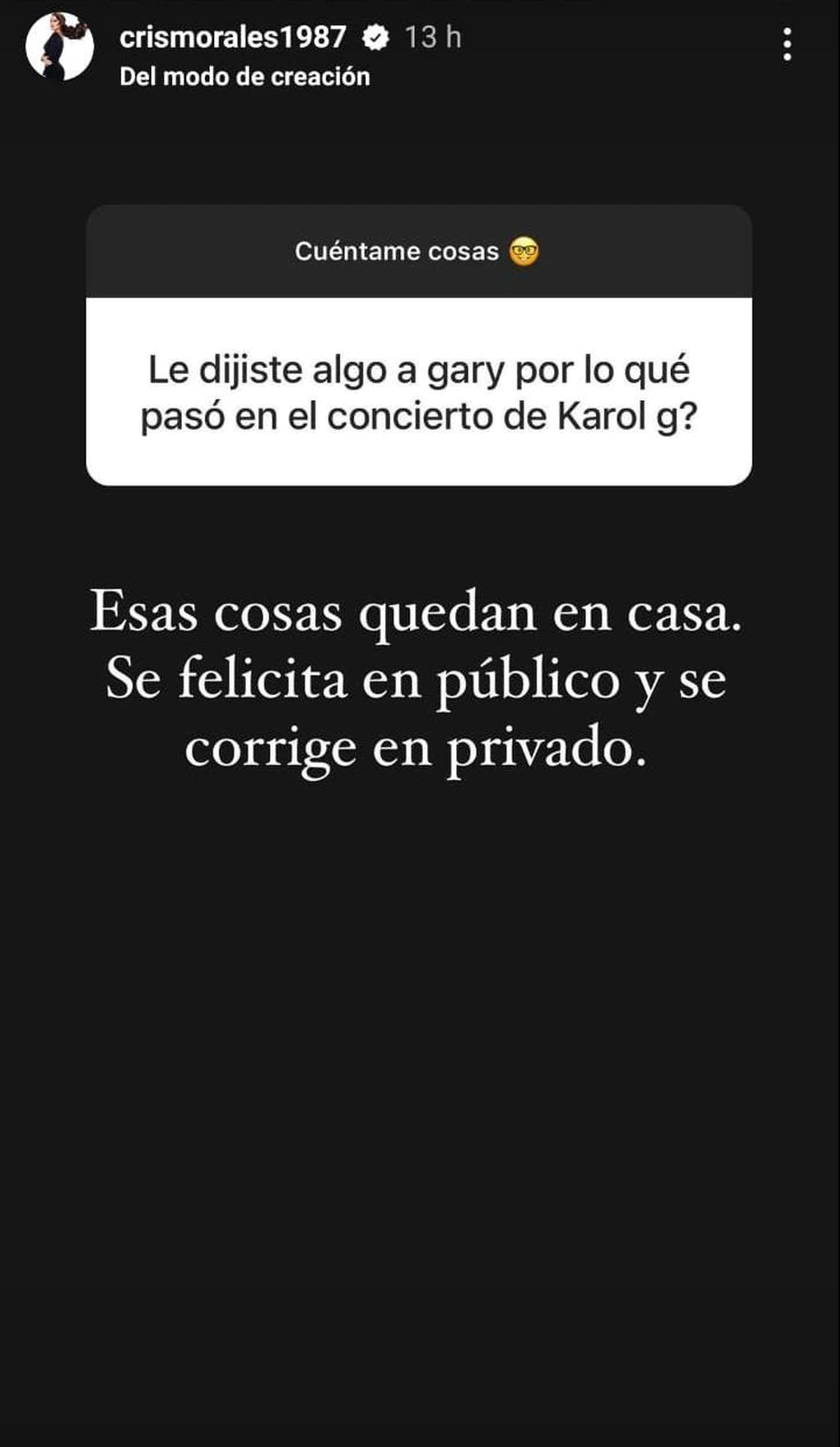 Mediante una historia en Instagram, tras ser consultada sobre si le dijo algo a su pareja por lo ocurrido en esa instancia, declaró que "esas cosas quedan en casa. Se felicita en público y se corrige en privado".