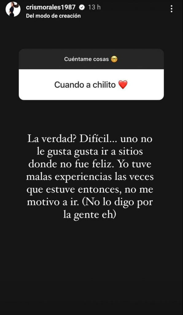 "A uno no le gusta ir a sitios donde no fue feliz. Yo tuve malas experiencias las veces que estuve (en Chile), entonces no me motivo a ir (no lo digo por la gente eh)", explicó.
