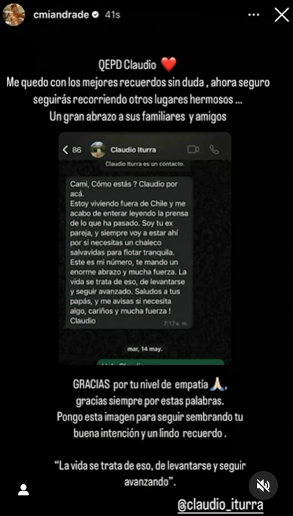 "Soy tu ex pareja y siempre voy a estar ahí por si necesitas un chaleco salvadidas para florar tranquila (...) La vida se trata de eso, de levantarse y seguir avanzando. Saludos a tus papás y me avisas si necesitas algo" fue parte de lo que le escribió Iturra.