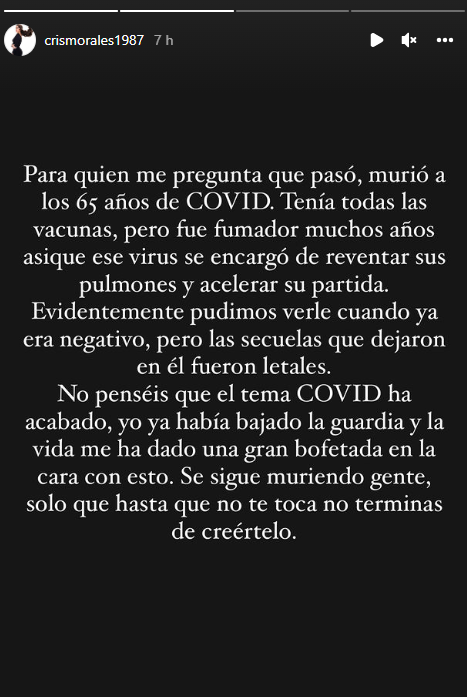 Luego, Morales señaló en una segunda historia que su padre murió a os 65 años al contagiarse de COVID-19, aclarando que “tenía todas las vacunas, pero fue fumador muchos años, así que ese virus se encargó de reventar sus pulmones y acelerar su partida”.