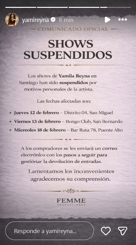 A través de un comunicado publicado en su cuenta de Instagram, el equipo de la actriz señaló: "Los shows de Yamila Reyna en Santiago han sido suspendidos por motivos personales de la artista".