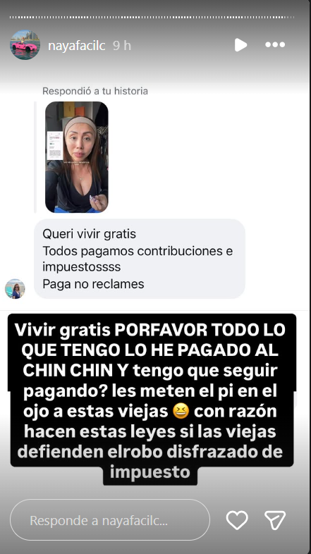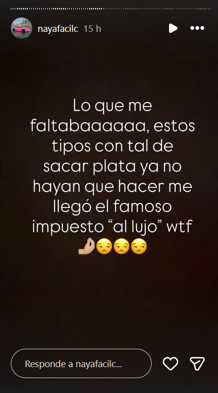 Al respecto, Naya arremetió en Instagram: “Tengo que pagar un impuesto al lujo. ¿Qué lujo? No tengo idea, todo lo que yo tengo me lo he sacrificado y me da mucha pena”.