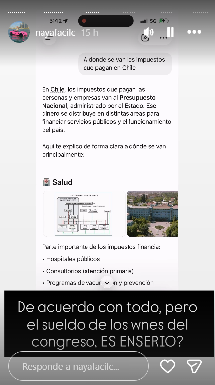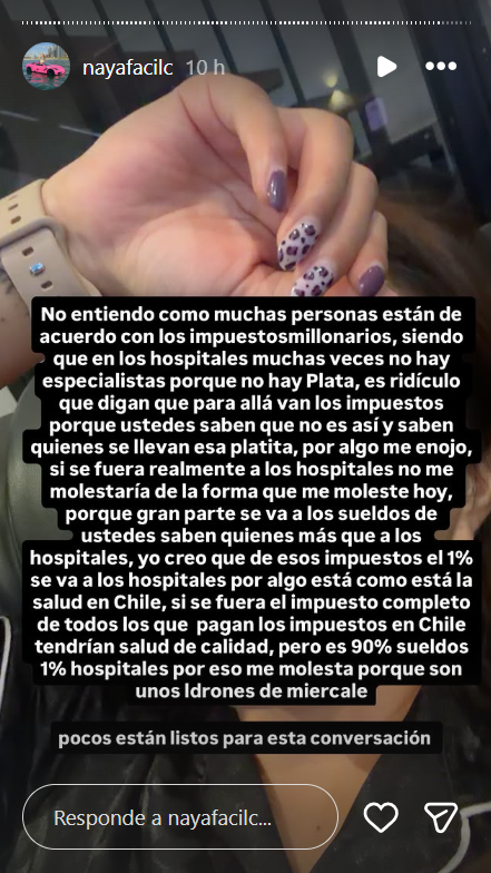 “No entiendo cómo muchas personas están de acuerdo con los impuestos millonarios, siendo que en los hospitales, muchas veces no hay especialistas porque no hay plata”, indicó la influencer.