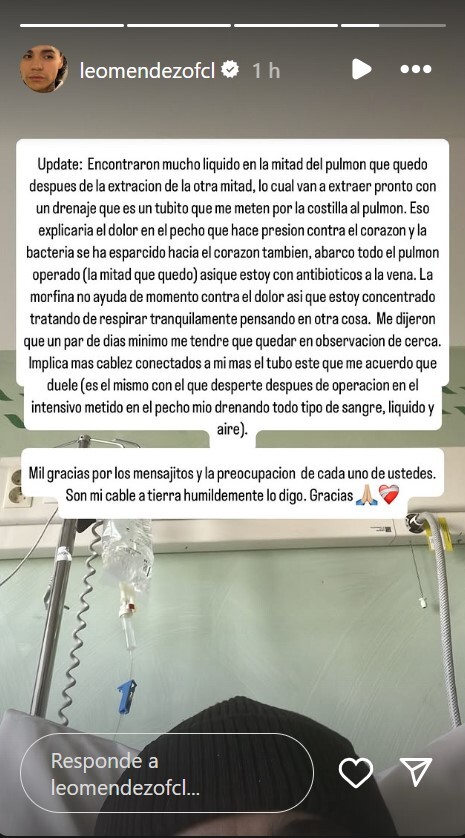 VER MÁS DE LEO MÉNDEZ“Encontraron mucho líquido en la mitad de pulmón que quedó después de la extracción, el cual van a extraer pronto con un drenaje, que es un tubito que meten por la costilla al pulmón”, contó a través de sus historias de Instagram.
