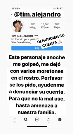 En una siguiente imagen, compartió el perfil del supuesto agresor, en la que escribió “Este personaje anoche me golpeó, me dejó con varios moretones en el rostro. Por favor se los pido, ayúdenme, a denunciar su cuenta. Para que no la mal use”.
