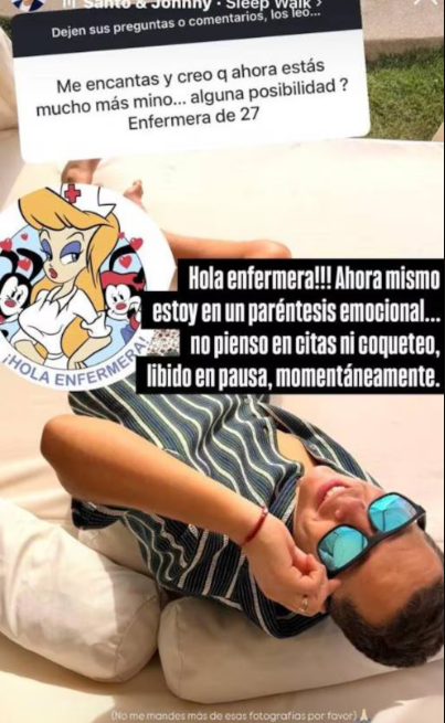 Al respecto, el comunicador fue tajante y contestó: "¡Hola, enfermera! Ahora mismo estoy en un paréntesis emocional. No pienso en citas, ni coqueteo. Líbido en pausa, momentáneamente".