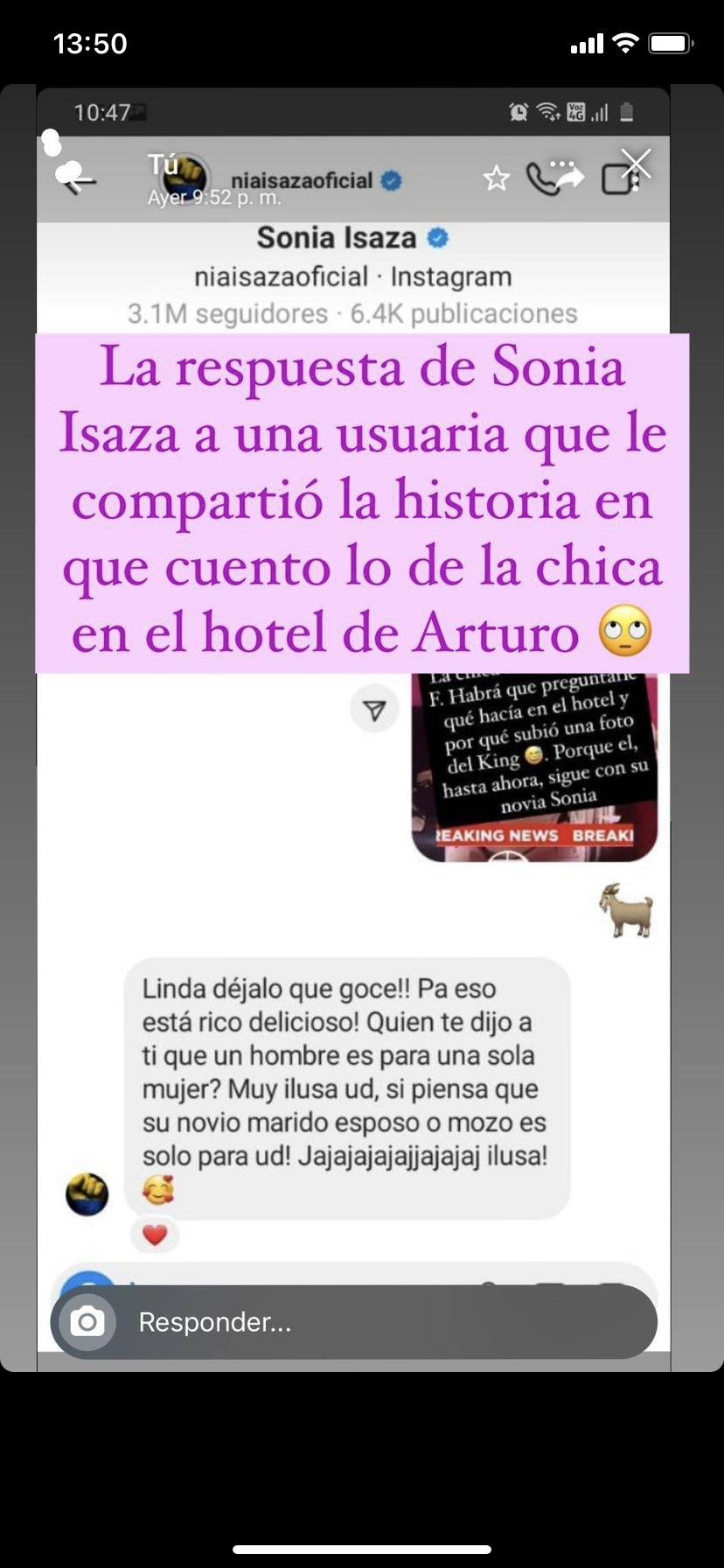 Lee también: J.C. Rodríguez debutó en la música urbana: Hasta "se tiró unos pasos" en videoclip de Arte EleganteLos rumores del supuesto encuentro entre el King y otra mujer llegaron finalmente hasta las manos de la actual pareja de Arturo, Sonia Isaza, quién no tardó en reaccionar, aunque no de manera pública sino a través de un mensaje directo en Instagram a una de las internautas que le envió la información.