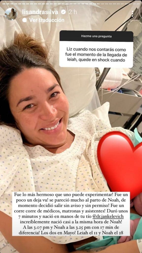 Según reveló Lisandra, el parto de Leiah "fue lo más hermoso que uno puede experimentar! Fue un poco de dejavú, se pareció mucho al parto de Noah, de momento decidió salir sin aviso y sin permiso!".