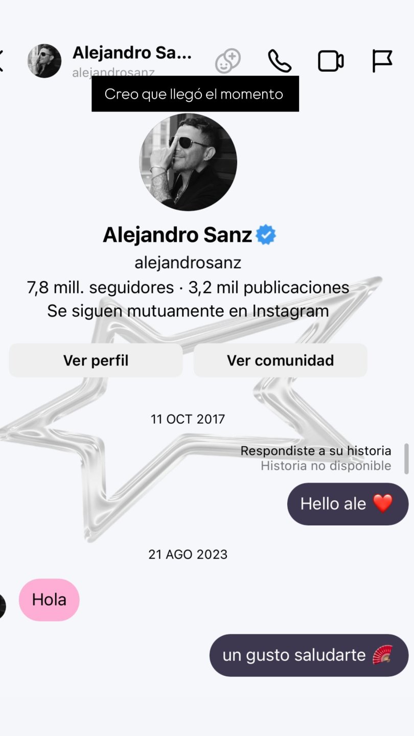 En el pantallazo se puede ver como Ríos le envía un mensaje al cantante en octubre de 2017, sin embargo, este no es respondido hasta agosto de 2023.