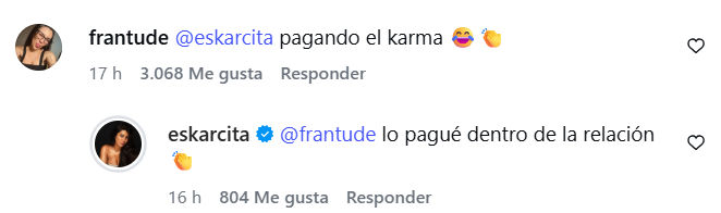 Momentos más tarde, en una publicación del Instagram Noticias Espectáculo que hablaba sobre esta reacción, Gálvez respondió al comentario de una usuaria: “Eskarcita pagando el karma”, escribió.