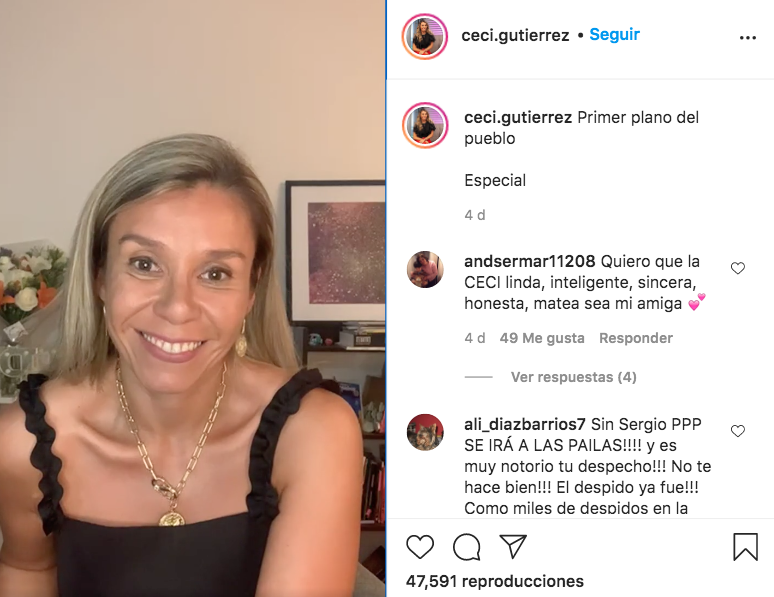 La periodista ahora está preocupada de su futuro, de seguir con su programa en Instagram cada jueves. Primero, eso sí, tiene que aclarar las diferencias que tiene con su compañero Sergio Rojas, quien en redes sociales afirma que seguirá trabajando en el Primer Plano del Pueblo y que la salida de Cecilia "no tiene que ver con ser mujer".