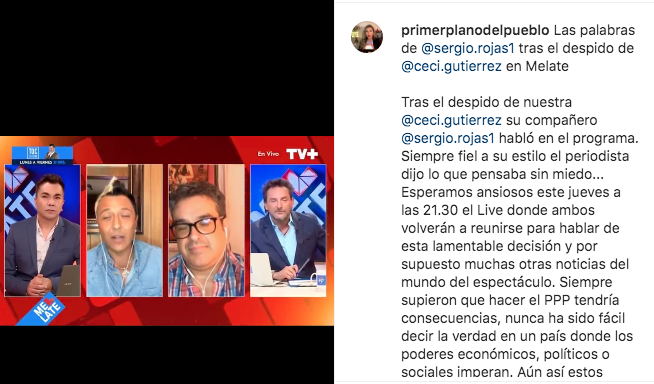 La ex conductora del show de TV+ fue despedida por lo que ella considera una decisión machista, la cual se debió netamente a su participación en Primer Plano del Pueblo, el live de Instagram donde ella junto a un compañero del panel, Sergio Rojas, también tratan temas de farándula.