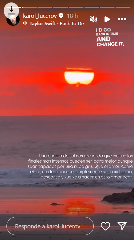 "Una puesta de sol nos recuerda que incluso los finales más intensos pueden ser para mejor, aunque sean tapados por una nube gris", señaló Karol en dicha publicación, acompañado de la fotografía de un atardecer.