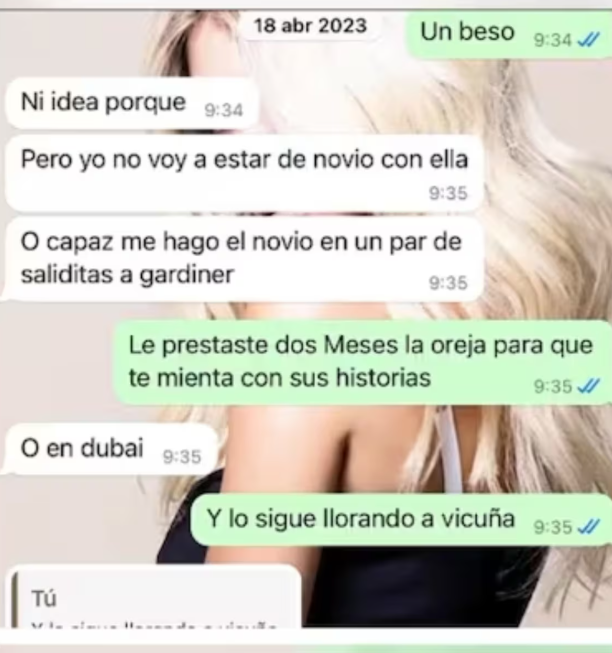 El periodista trasandino Ángel de Brito aseguró que las capturas de pantalla fueron tomadas desde el teléfono celular de Wanda Nara, y en ellas leyó que Icardi le escribió: "Yo no voy a estar de novio con ella (China). O capaz me hago el novio en un par de saliditas a Gardiner o en Dubai".