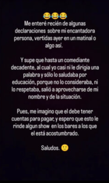 Además agregó: "Y supe que hasta un comediante decadente, al cual yo casi ni le dirigía una palabra y sólo lo saludaba por educación porque no lo consideraba, ni lo respetaba, salió a aprovecharse de mi nombre y de la situación".