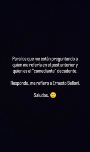 Finalmente, decidió decir explícitamente para quién iban dirigidos sus dichos: "Para los que me están preguntando a quién me refería en el post anterior y quién es el ‘comediante’ decadente, respondo: me refiero a Ernesto Belloni".
