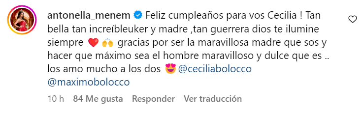 A través de su cuenta de Instagram, Antonella comentó la publicación de Máximo donde le dedicó emotivas palabras a su madre y comentó: "¡Feliz cumpleaños para vos, Cecilia! Tan bella, tan increíble mujer y madre. Tan guerrera".